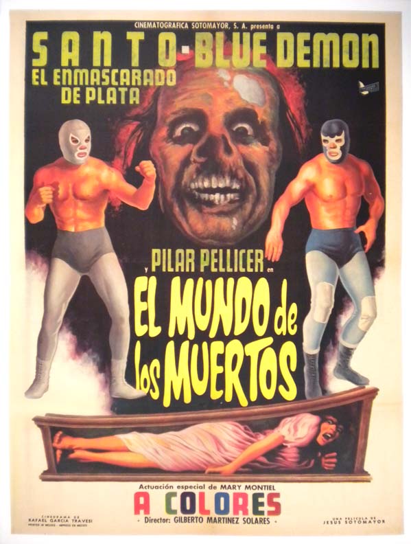 Striking Mexican horror / lucha libre film poster features great macabre images of heroic masked wrestlers El Santo and Blue Demon, plus a frightened woman in a coffin and a large zombie-like creature. Hard-to-find poster with great style... The film starred El Santo, Blue Demon, Pilar Pellicer, Mary Montiel, Antonio Raxel and Betty Nelson. (This poster is mounted on linen, so it must be sent rolled.) $395 |