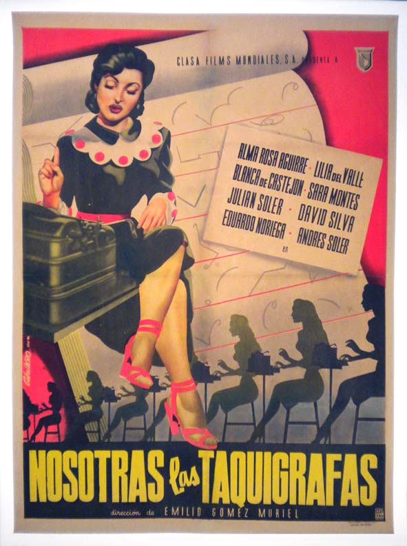 Fabulous Mexican comedy poster with a striking image of the lovely Aguirre sitting at her typewriter -- with silhouettes of a row of secretaries pictured in the background. The color and art deco design are superb, making this one of the most beautiful Mexican posters of it's era... The film starred Alma Rosa Aguirre, Lilia del Valle, Blanca de Castejon and Sara Montes. (This poster is mounted on linen, so it must be sent rolled.) $395 |