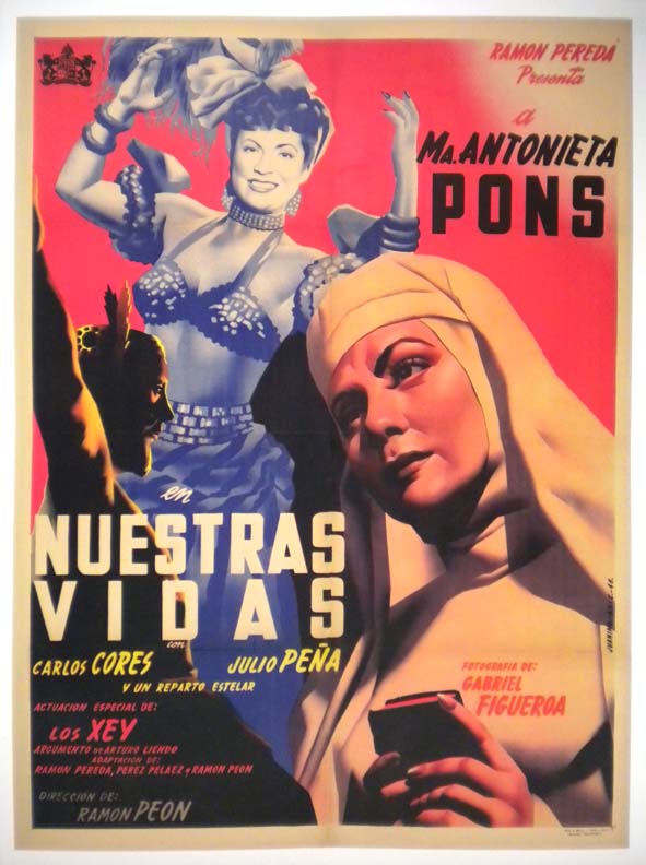 Striking Mexican movie poster shows images of women representing contrasting lifestyles -- one a nun and the other a sexy showgirl. Very pretty design and color, by famous artist Renau's brother... This movie starred Maria Antonieta Pons, Carlos Cores, Julio Pena, Arturo Soto Rangel and Prudencia Grifell. (This poster is mounted on linen, so it must be sent rolled.) $395 |