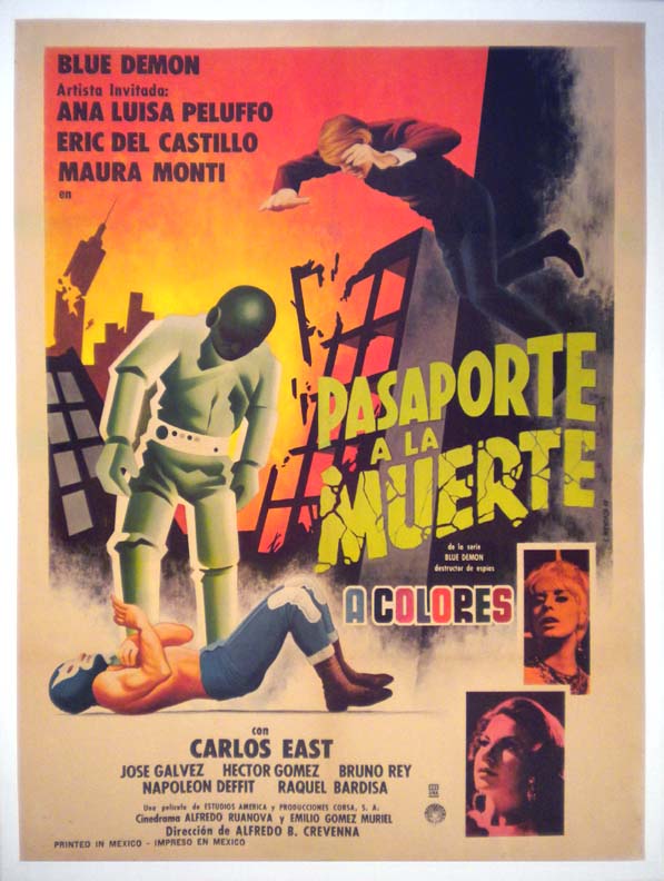 Colorful Mexican sci-fi / lucha libre movie poster pictures masked wrestler Blue Demon battling an indestructible android-robot. The entertaining film was issued during Blue's espionage period. Same artwork as the onesheet... This movie starred Blue Demon, Ana Luisa Peluffo, Eric del Castillo, Maura Monti and Carlos East. (This poster is mounted on linen, so it must be sent rolled.) $350 |
