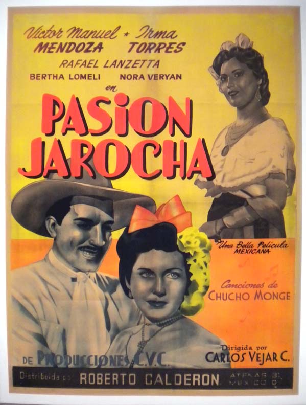 Elegant Mexican musical film poster with an unusually graceful style. The artwork features attractive coloring and classic images of the main stars. There is some touch-up on the yellow background area near the top, but this does not greatly detract from the beautiful main image. It will display quite well!... The film starred Victor Manuel Mendoza, Irma Torres, Rafael Lanzetta, Bertha Lomeli and Nora Veryan. (This poster is mounted on linen, so it must be sent rolled.) $395 |