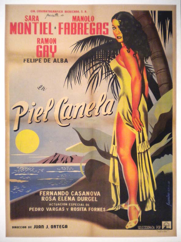Gorgeous Mexican romance / melodrama movie poster features a lovely image that you might expect to see on an exotis travel poster -- a beautiful and sexy woman -- Ms. Montiel -- standing beneath a palm tree. A true classic! There is some toning along the folds, but this does not greatly detract from the beautiful main image... The film starred Sarita Montiel, Manolo Fabregas, Ramon Gay and Felipe de Alba. (This poster is mounted on linen, so it must be sent rolled.) $495 |