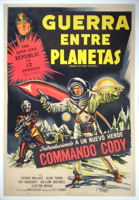Spectacular Argentine onesheet poster (29x43") from the classic U.S. sci-fi serial, RADAR MEN FROM THE MOON. This was the second outing in Republic Studio's Rocketman series. There are superb sci-fi graphics, including: spacemen, rocket ships, ray guns, and a great shot of rocketman, himself!... The film starred George Wallace, Aline Towne and Roy Barcroft. (This poster is mounted on linen, so it must be sent rolled.) SOLD |