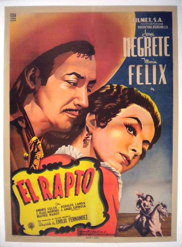Beautiful Argentine onesheet poster (29x43") from a classic Mexican ranchera / romance movie. It features close-up portraits of two of the most beloved of all Mexican screen stars ... Felix and Negrete. Beautiful onesheet from Jorge's final film. This poster has been professionally mounted on linen. It looks great and is ready to display!... The film starred Jorge Negrete, Maria Felix, Andres Soler, Jose Elias Moreno and Rodolfo Landa. (This poster is mounted on linen, so it must be sent rolled.) $475 |