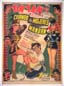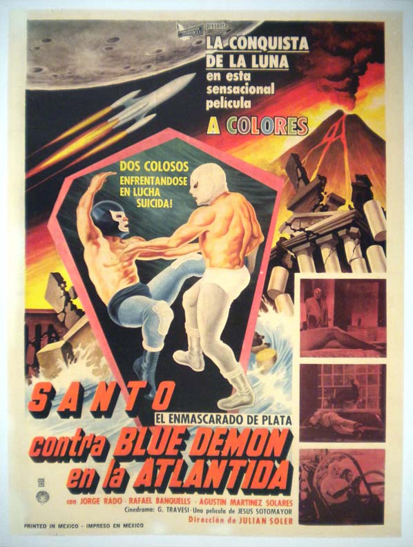 Impressive Mexican sci-fi / lucha libre movie poster features great renditions of the two wrestling stars. Surrounding the fighting heroes, are a montage of images from the film, including a rocketship zooming through space... The film starred El Santo, Blue Demon, Jorge Rado, Rafael Banquells and Agustin Martinez Solares. (This poster is mounted on linen, so it must be sent rolled.) $395 |