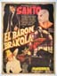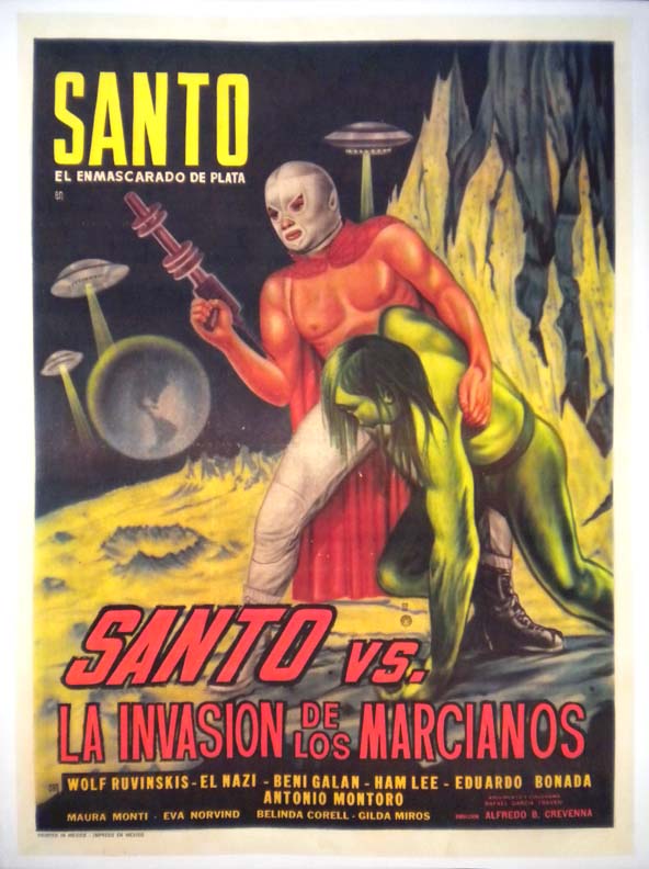 This title started me collecting Mexican movie posters! Superb lucha libre / sci-fi movie poster sports vibrantly colored art work, which features a great central image of 'El Santo,' suppporting an unconscious green-skinned Martian. Spectacular!... The film starred El Santo, Wolf Ruvinskis, Maura Monti, El Nazi, Beni Galan, Ham Lee and Frankenstein. (This poster is mounted on linen, so it must be sent rolled.) SOLD |