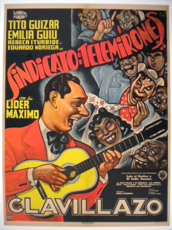 Colorful Mexican musical comedy movie poster done in a classic style by, Ernesto Garcia Cabral. The central portion features a large image Mr. Guizar, surrounded by caricatures of his slightly demented looking audience... The film starred Tito Guizar, Emilia Guiu, Antonio 'Clavillazo' Espino, Rebeca Iturbide, Eduardo Noriega and Lider Maximo. (This poster is mounted on linen, so it must be sent rolled.) $795 |