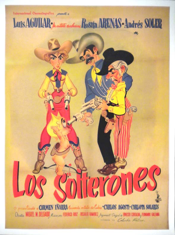Gorgeous comedy / ranchera film poster features a wonderful image of the three main characters (Aguilar, Arenas, Soler), holding a cute baby at gunpoint. This is one of the most attractive Mexican posters it the era. This is a used poster with some mild wear and toning, but otherwise, the onesheet will display beautifully... The film starred Luis Aguilar, Rosita Arenas, Andres Soler, Carmen Ignarra and Carlos Agosti. (This poster is mounted on linen, so it must be sent rolled.) $395 |