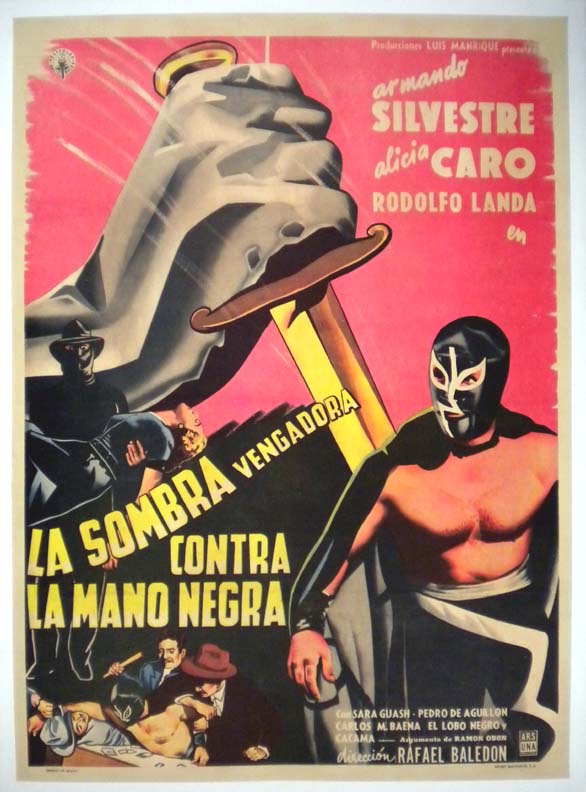 Another beautiful Mexican lucha libre style poster -- from a movie that was released as a super hero / sci-fi serial. This one features a great image of the mysterious masked hero, plus some wonderful art deco design. Second film in the "Sombra Vengadora" series.... This movie starred Armando Silvestre, Alicia Caro, Fernando Oses and Rodolfo Landa. (This poster is mounted on linen, so it must be sent rolled.) $375 |
