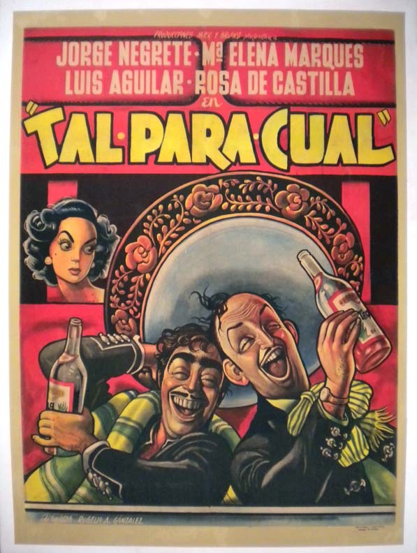 Gorgeous Mexican comedy / musical movie with vibratly colored artwork by Ernesto Garcia Cabral. The onesheet features wonderful caricatures of the two male leads getting drunk, while a disapproving Ms. Marques looks on from the background! There are some areas with restoration on the background portions of the poster, but the main artwork looks great and the poster will display beautifully!... The film starred Jorge Negrete, Maria Elena Marques, Luis Aguilar and Rosa de Castilla. (This poster is mounted on linen, so it must be sent rolled.) $995 |