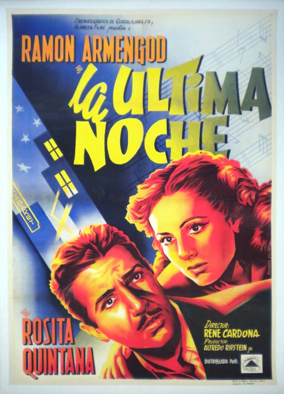 Stunning Mexican romance film poster with a definite film noirish style. The art work is both striking and vibrantly colored -- with superb portraits of the two stars, plus a city backdrop -- where everything seems a bit off-kilter.... The film starred Sara Garcia, Meche Barba, Carlos Orellana, Luis Beristain and Lupe Inclan. (This poster is mounted on linen, so it must be sent rolled.) $395 |