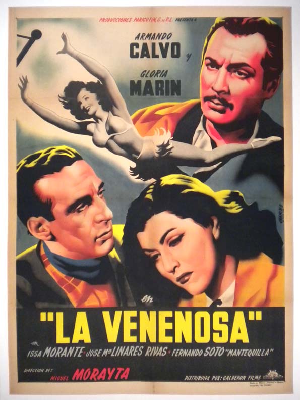 Beautiful Mexican circus / crime film poster has a some great portraits of the stars, plus an image of a sexy trapeze artist in action. The poster was done by Juanino Renau Berenguer, who's brother was another of the great Mexican poster artists; Renau!... The film starred Gloria Marin, Armando Calvo, Jose Maria Linares-Rivas and Ramon Gay. (This poster is mounted on linen, so it must be sent rolled.) $365 |